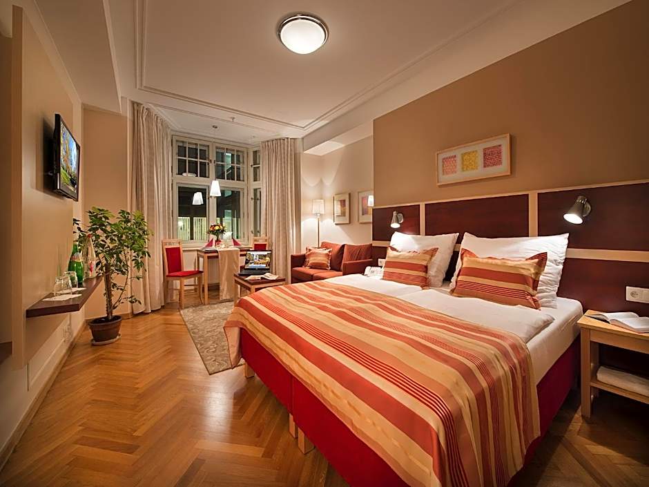 A studio with a queen-size bed for 2 people or two single beds. The unit features a satellite TV, a kitchenette, and a bathroom with a bathtub. There is also a view of the Wenceslas Square.