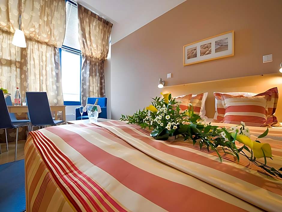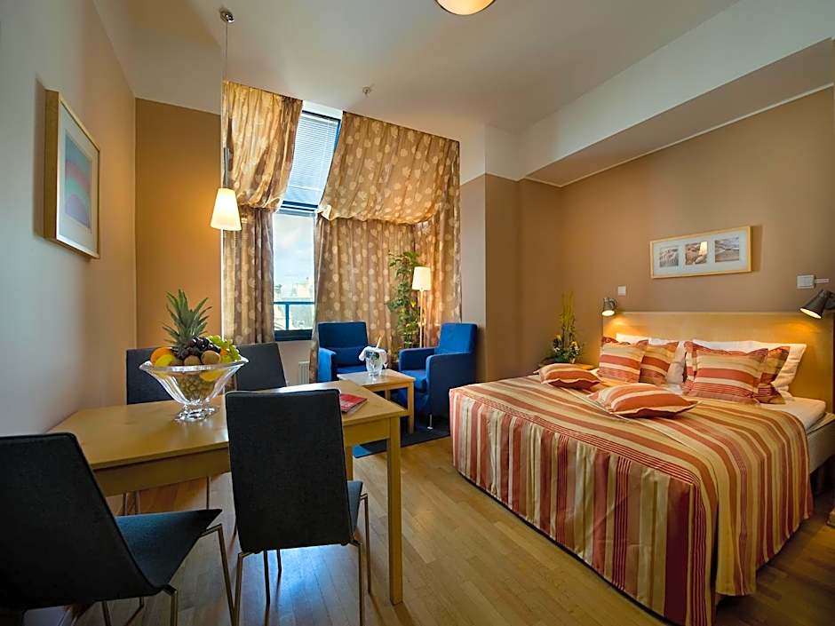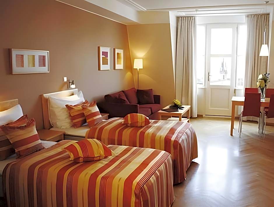 A studio with a queen-size bed for 2 people or two single beds. The unit features a satellite TV, a kitchenette, and a bathroom with a bathtub. There is also a view of the Wenceslas Square.